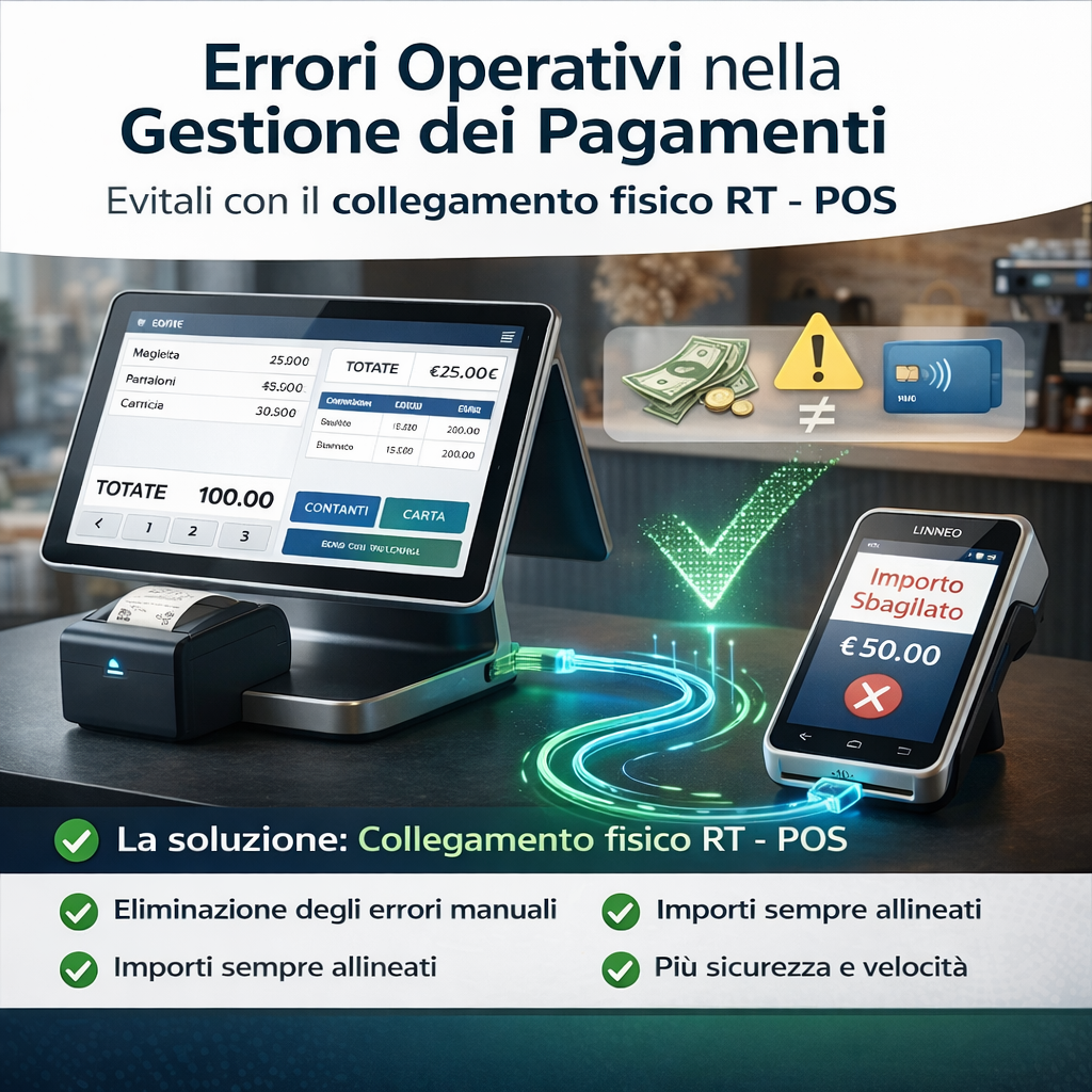 La soluzione più utilizzata per evitare errori e che sempre più attività stanno scegliendo di utilizzare è il collegamento fisico tra RT e POS con la modalità di scambio importo. Il totale viene inviato in automatico dalla cassa al pos evitando qualsiasi errore umano.